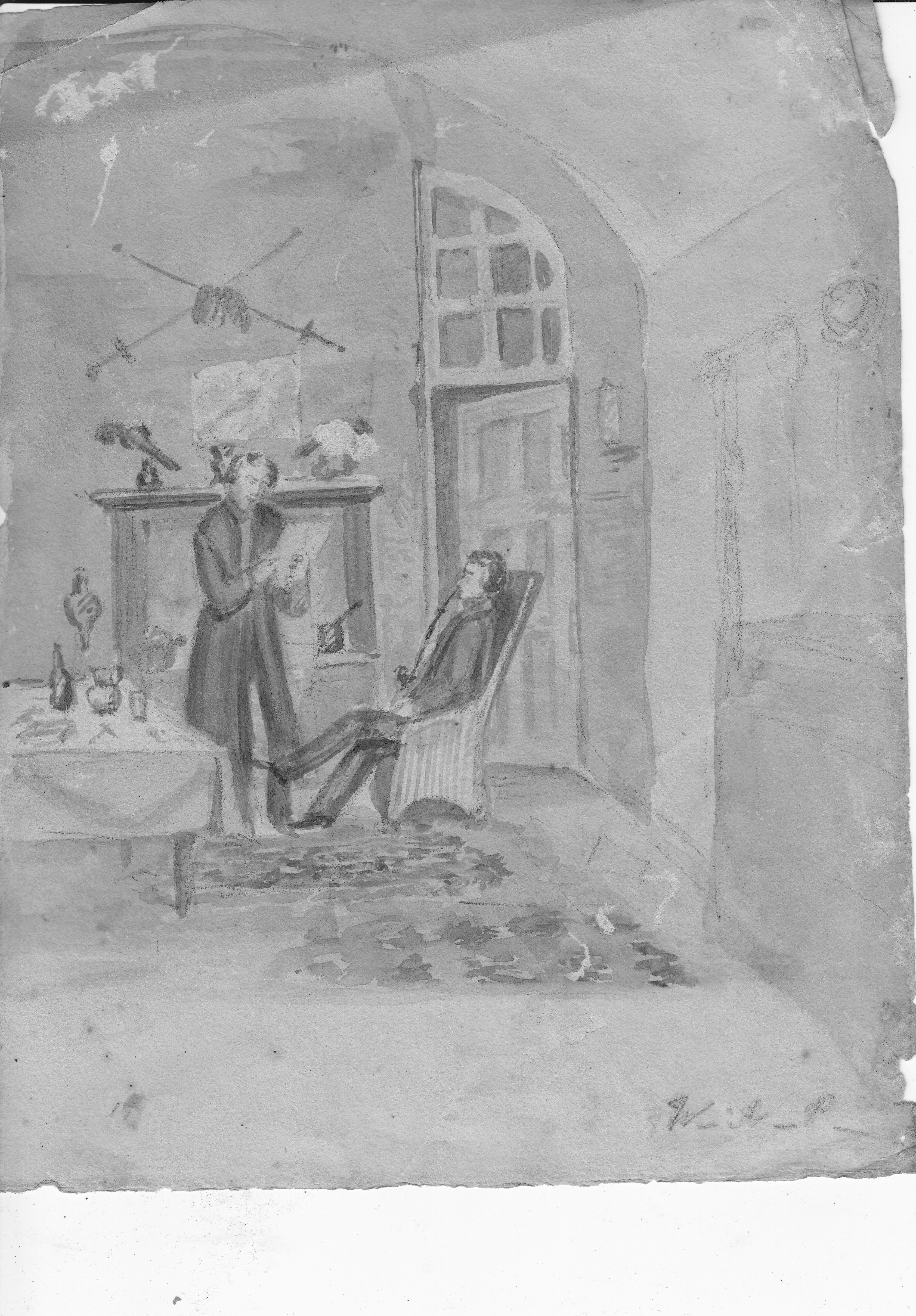 William M-P became an ensign 2) in the 59th (2nd Nottinghamshire) Regiment of Foot. His regiment is confirmed by some loose blank pages, originally part of a book, with the inscription ‘W.A. Murray Prior. 59th Regt.” He died at Portsmouth from a gunshot wound on 5 February 1844 – presumably an accident when training. His brother TLM-P wrote in a prayer book he owned that William died when he was 22 years, 2 months and 17 days old – a precision which suggests profound grief. William, like his father, was a career soldier - but also an artist. The seriousness with which William took his art is seen by a very large, thick, heavy album in which he collected his sketches and examples of art.3). I have a smaller volume engraved ‘Bruges 1841’ containing lithographs of sketches of life in Bruges. There is also a reputed self-portrait of William.4)